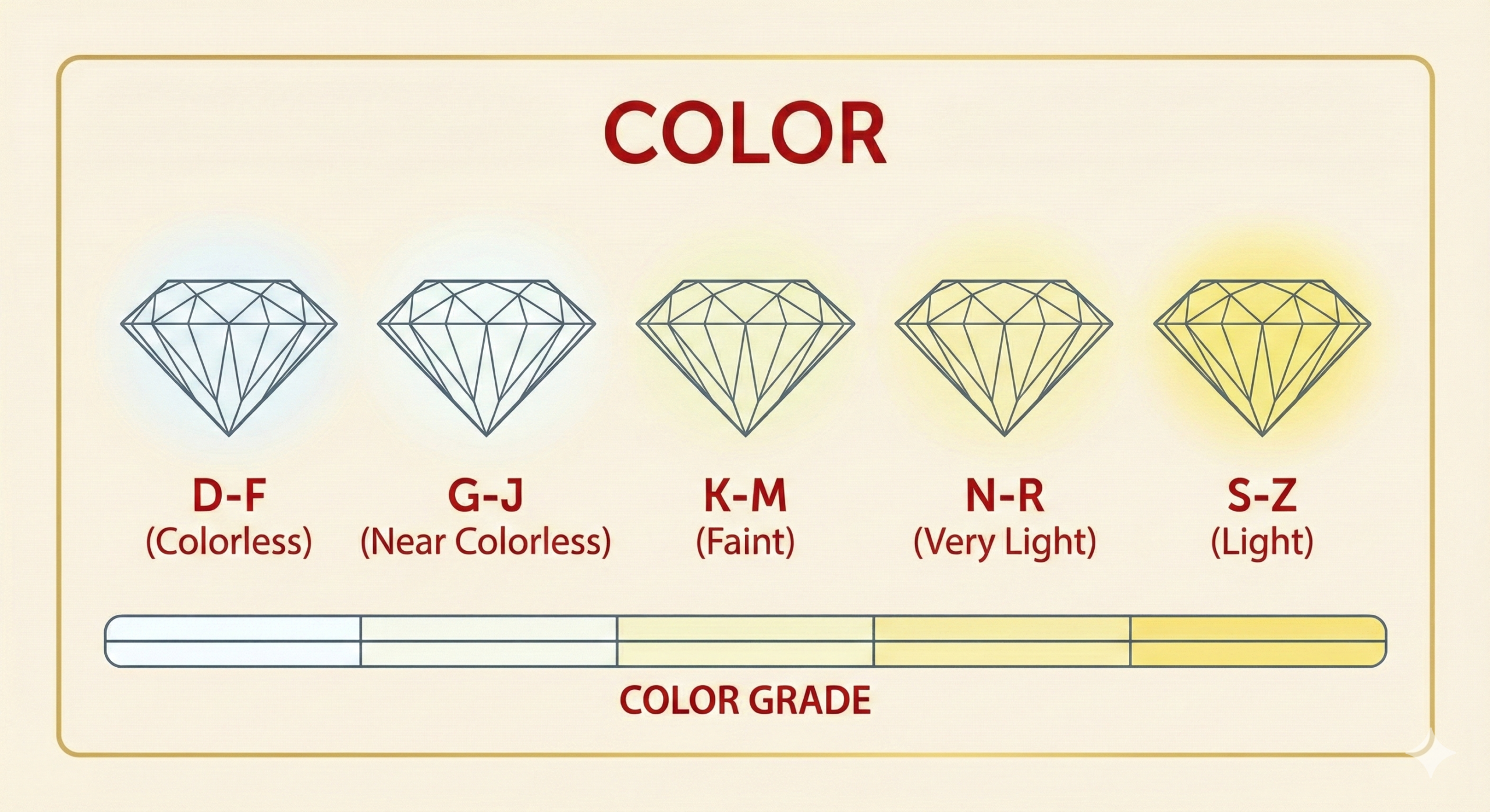 - Colorless (D-F): Rare, icy white.
